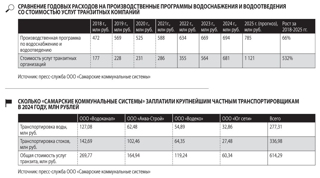С каждым годом все больше денег, собираемых за счет тарифа потребителей, перетекает владельцам частных компаний, сумевших завладеть транзитными участками труб. 2025 год станет в этом плане переломным — впервые коммерсантам за транзит придется заплатить 1,12 млрд рублей — это больше, чем за ремонт и поддержание коммуникаций. Если тренд не переломить, на ремонт скоро не останется ничего. Главные бенефициары происходящего — фирмы, аффилированные с крупными самарскими застройщиками: корпорацей «Кошелев» и группой «Древо», а также предприниматели с Северного Кавказа и из Заполярья.