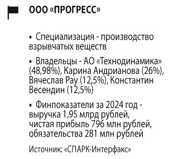 На протяжении своей истории «Прогресс» неоднократно менял владельцев. Изначально предприятие было подконтрольно одному из крупнейших предприятий Чапаевска АО «Полимер», от которого, собственно, отпочковалось большинство местных производителей взрывчатых веществ. Сейчас «Полимер» контролируют структуры холдинга «Технодинамика». Со временем «Полимер» ряды совладельцев «Прогресса» покинул, а прямые связи чапаевского завода с «Технодинамикой» и ее менеджментом только крепли. Источник, знакомый с ситуацией, излагает версию, согласно которой по факту «Прогресс» полностью подконтролен структурам, близким к менеджменту холдинга. С официальной точки зрения контрольными долями «Прогресса» в разные периоды владели организации, публичными лицами которых выступали Вячеслав Рау и Константин Весендин. В сентябре 2022 года в число совладельцев «Прогресса» вошла «Технодинамика» с долей 24,98%. С этого момента и двинулись резко в рост показатели работы предприятия. В 2023 году выручка завода возрастает с 505 млн до 1,25 млрд рублей, а прибыль — с 107 млн до 451 млн. При этом в 2023 и 2024 годах «Прогресс» начал активно выплачивать дивиденды, что не отражалось в отчетности за более ранние периоды. Согласно системе «СПАРК-Интерфакс», чапаевский завод за два года выплатил своим совладельцам дивидендов совокупно на сумму около 920 млн. При этом «Технодинамика» могла рассчитывать в лучшем случае на четверть этой суммы.
