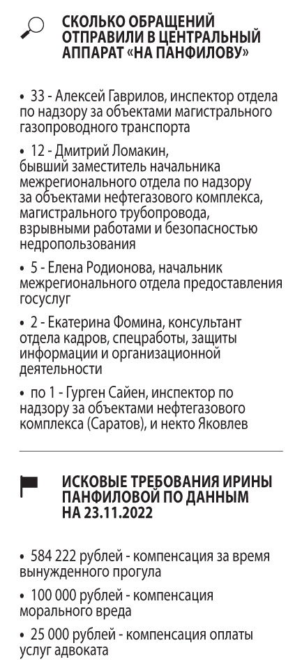 В числе первых на этом заседании исследовали «массовые обращения» на Ирину Панфилову, поступившие в последние месяцы ее работы. Они были представлены ответчиком как одно из обоснований решения не заключать с ней новый контракт. После знакомства с этими письмами сторона истца представила такую статистику. Из 112 обращений центральный аппарат удовлетворил всего 1 от юрлица и 2 от физлиц. Из Средне-Поволжского управления поступило 54 письма (то есть почти половина), но — всего от шести сотрудников. Почти все они за различные нарушения наказывались Ириной Панфиловой. В том числе инспектор Алексей Гаврилов, который выступил автором сразу 33 обращений.