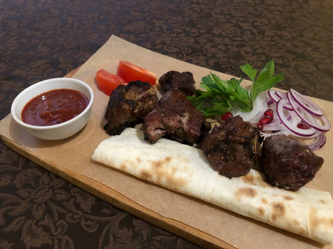 — шашлык из свиной шеи (410 рублей) и из мякоти ягненка (530 рублей), оба по 250 грамм, так что цена вполне приемлемая за такой выход. Мясо замариновано прекрасно, из замечаний – попалась пара жилистых кусков. Но это не критично. Соус «Тар-тар» удивил ценой: 100 рублей за 50 грамм. Но он того стоил, потому что сделан по всем ресторанным канонам.