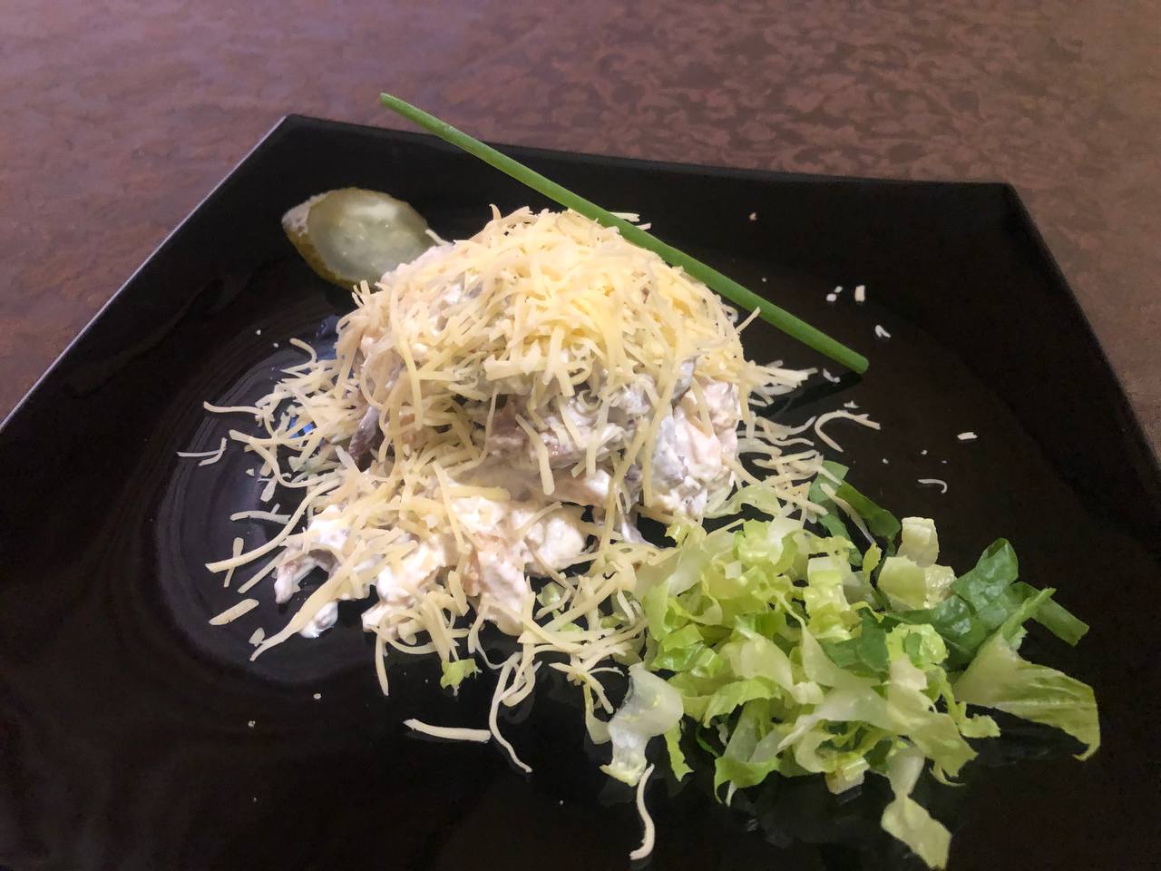 — салат «Неаполь» с курицей, 350 рублей. Сытный, с настоящими бочковыми огурцами. Майонезная заправка имеет взвешенный вкус – не из дешевого сырья.
