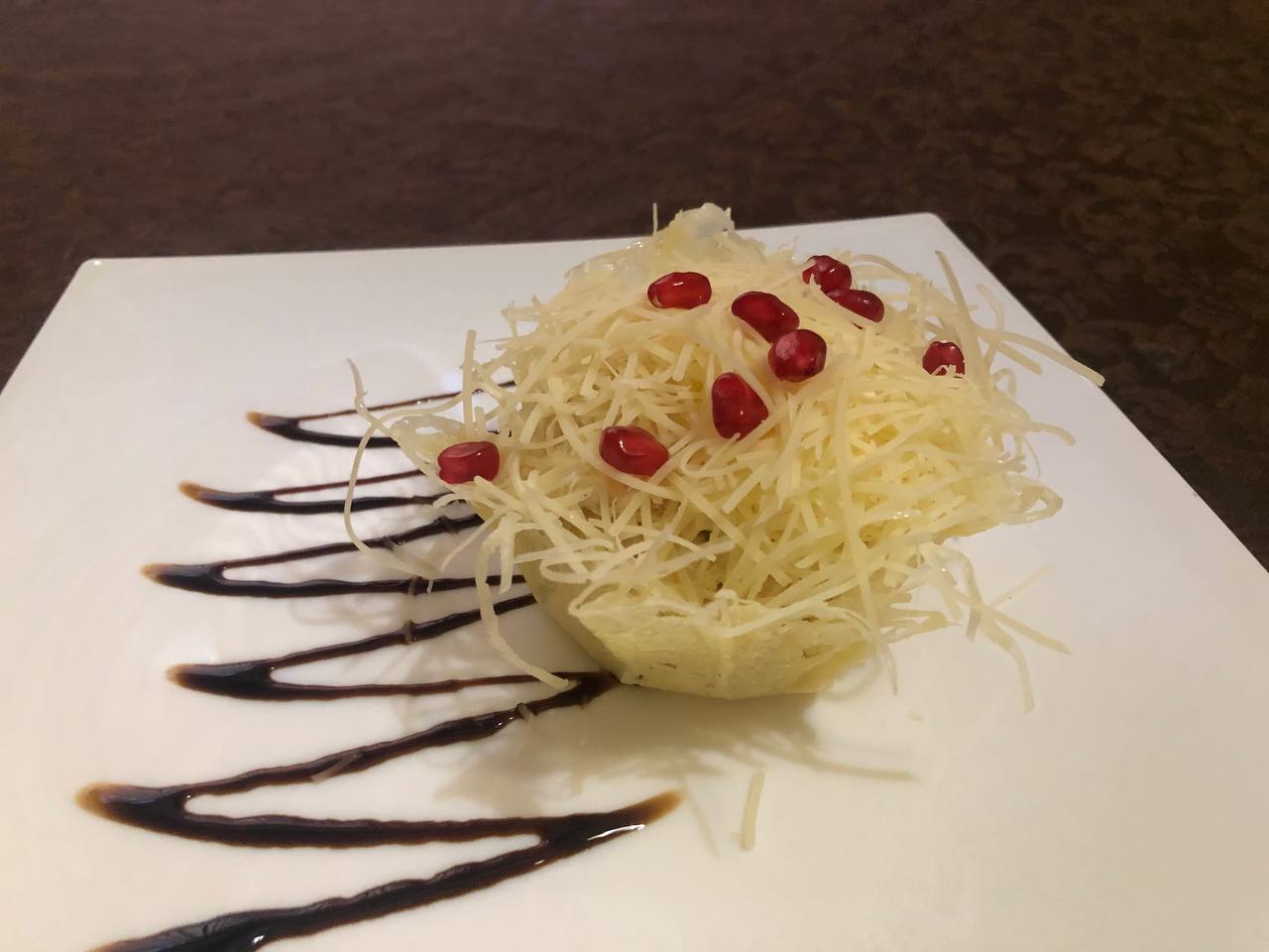 — салат «Шарм», 390 рублей. Очень вкусный, в сырной корзиночке, жаль, что таким простым рецептом пренебрегают многие кафе. Сочное куриное филе отлично дополняют консервированные ананасы.