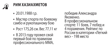 — Да, Рим — это полное имя. Так меня назвал папа. Он мне рассказывал, что однажды когда-то в своей молодости услышал имя Рим и решил, что сына назовет так же. Да, имя редкое и многие удивляются. Но спасибо папе — с таким именем мне и прозвище, которое часто дается бойцам в единоборствах, ни к чему. (Улыбается.) Кстати, именно папа привел меня в спорт. Мне в то время еще 10 лет не было. И я, можно сказать, продолжил спортивную династию нашей семьи. Мой отец Тахир Хазиахметов — мастер спорта СССР, чемпион СССР по самбо. Поэтому и база у меня изначально — самбо, ныне признанный олимпийский вид спорта. Каков мой путь единоборца? Начинал с самбо и дзюдо во Дворце спорта «Волгарь» г. Тольятти у Николая Костина. Моя первая грамота датирована 1998 годом. Мне тогда было 10 лет. Потом, когда мы переехали в Старый город, известный как Центральный район города Тольятти, я продолжил заниматься самбо и дзюдо в школе №91 у тренеров Анатолия Бекина, Артура и Эдуарда Шариповых. В то время самбо и дзюдо — два вида боевого искусства, по технике схожие друг с другом. В обоих есть захваты, броски, болевые и удушающие приемы, но есть различия в правилах и оценках на соревнованиях. Примерно тогда же тренер Андрей Анатольевич Старостин предложил расширить мой спортивный кругозор и попробовать себя в рукопашном бое. По «рукопашке» у меня папа выступал, а я очень хотел быть на него похожим. Поэтому я, недолго думая, согласился. Заявился на соревнования, выступил и попал в призы. Сейчас я тренируюсь у отца, он начал тренерскую деятельность после того, как вышел на пенсию из милиции.