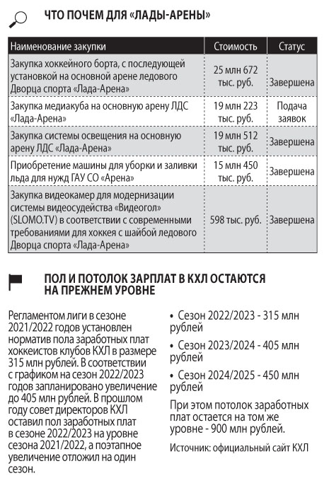 Возвращение «Лады» в КХЛ потребует и дополнительных работ по реконструкции домашней арены клуба, чтобы она соответствовала требованиям регламента лиги. Сейчас на сайте госзакупок размещены заявки Государственного автономного учреждения Самарской области «Арена» на поставку необходимого оборудования. На момент сдачи номера «СО» в печать одна заявка, на борта, уже трансформировалась в контракт, остальные — на приобретение освещения, видеокуба, ледоуборочной машины и системы «Видеогол» — получили статус «завершены», после чего дается десятидневный срок на подписание договора поставки. Все недостатки по ледовой арене должны быть устранены до 1 августа. «Мы гарантируем реконструкцию арены к сезону, но на всякий случай попросим первые матчи провести на выезде», — уточнил Александр Чеботарев.