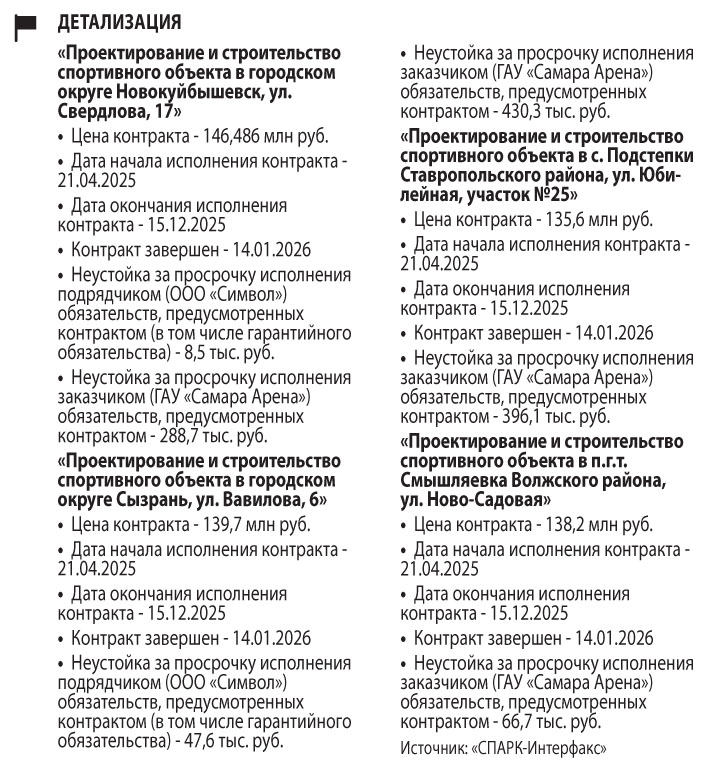 Подрядчик, ООО «Символ», получил претензии по просрочке на общую сумму около 56 тыс. рублей по двум объектам. В то же время заказчик, ГАУ «Самара Арена», допустил нарушения по всем четырем контрактам; общая сумма начисленных претензий составила почти 1,2 млн рублей.