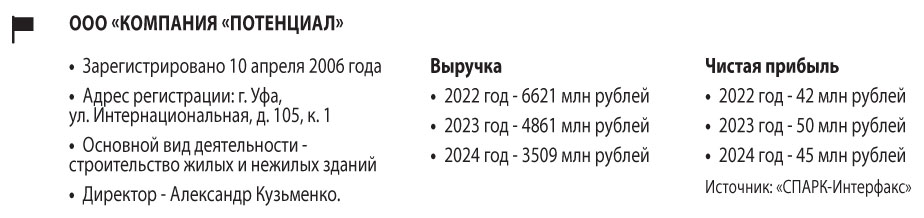 ООО «Компания «Потенциал» работает с апреля 2006 года, входит в бизнес-группу, главным публичным лицом которой выступает 58-летний Эдуард Остапчук — депутат Уфимского горсовета, председатель комиссии по архитектуре, строительству, земельным и имущественным отношениям. Другие крупные компании группы — ООО «Петроком», ООО «Сигма» (см. допматериал «Остапчук тут, Остапчук там»); общий оборот основных предприятий в 2024 году превысил 6 млрд рублей.