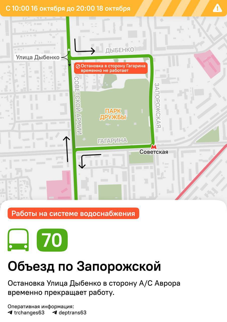 В связи с работами изменится маршрут общественного транспорта. «Автобус № 70 в прямом направлении будет следовать с объездом по улицам Дыбенко и Запорожской», — сообщили в городской администрации Самары.
