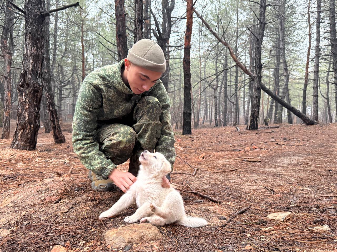 Недавно боец сам взял опеку, только за “брата меньшего” – пса “Умку”, прозванного так за схожесть с маленьким медвежонком из мультфильма. За несколько месяцев он стал неотъемлемой частью боевой семьи. Его любимое лакомство в армейском рационе – тушёнка. Поэтому растёт и крепнет будто по часам. К ней он пристрастился ещё с первого дня во взводе.