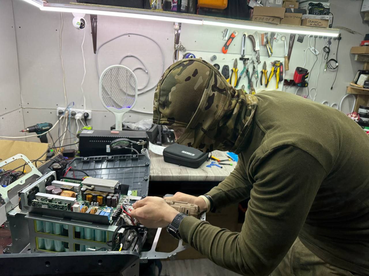 В своей мастерской “Ворон” обслуживает и ремонтирует зарядные станции, дроны и прочую электротехнику. За делом показывает и объясняет свою работу напарнику. Он немногословен, но ученик легко понимает его. Их разговор напоминает общение братьев, увлечённых общим делом.
