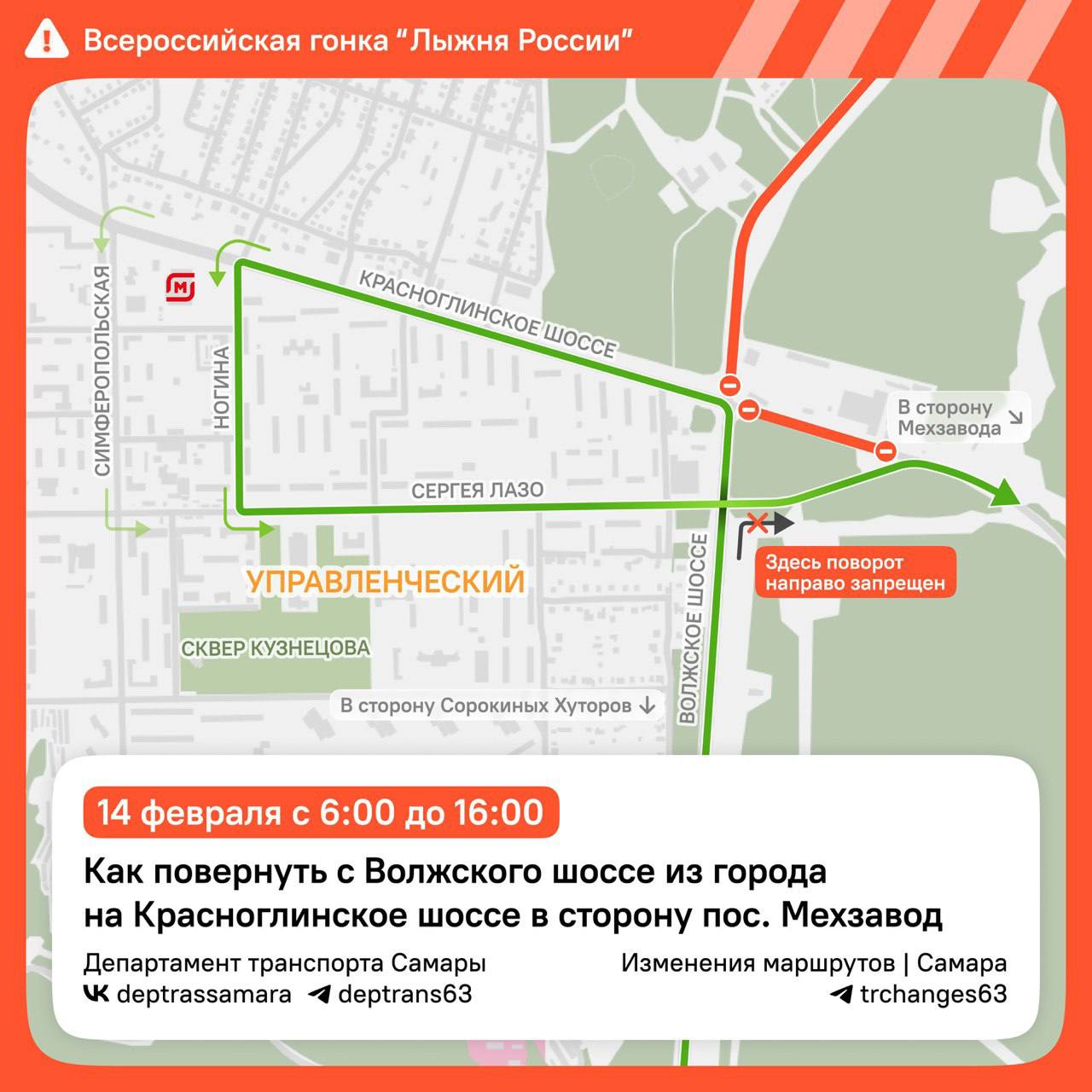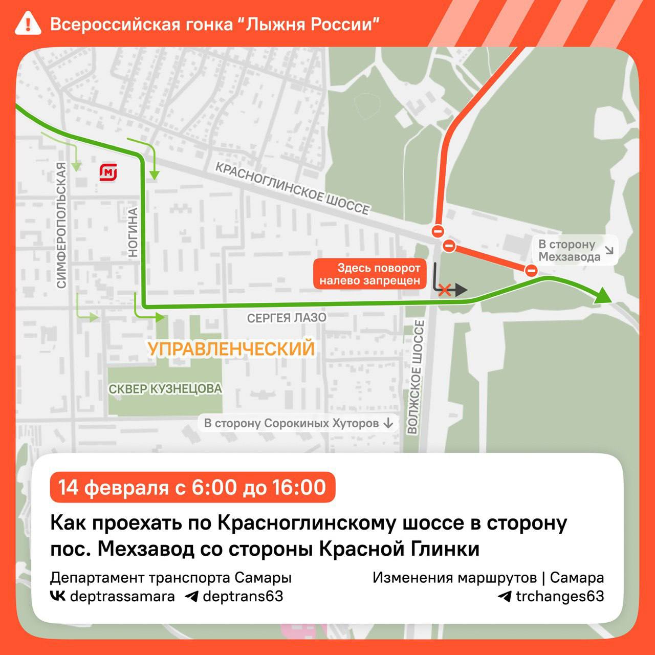 В субботу, 14 февраля, движение транспорта в Красноглинском районе Самары будет частично ограничено в связи с проведением массовой лыжной гонки «Лыжня России». Ограничения продлятся с шести утра до четырех часов дня.