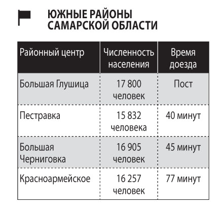 Теперь этот арсенал доступен жителям южных районов Самарской области. Пост санавиации в Большой Глушице обслуживает также Пестравский, Большечерниговский и Красноармейский районы. До Пестравки бригада добирается за 40 минут, до Большой Черниговки — за 45 минут, до Красноармейского время доезда составляет чуть более часа. По словам руководителя управления организации скорой и специализированной медицинской помощи министерства здравоохранения Самарской области Галины Черногаевой, организация поста в Большой Глушице позволила приблизить медицинскую помощь к населению юга Самарской области. «Этот пост создан для того, чтобы сократить время доезда в близлежащие районы. Время доезда сокращается почти вдвое», — говорит она.
