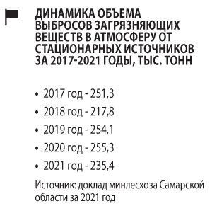 Согласно докладу об экологической ситуации в Самарской области за 2021 год, на территории региона специалистами ФГБУ «Приволжское УГМС» проводилось дополнительное исследование загрязнения атмосферного воздуха. Было обследовано 118 населенных пунктов в 24 районах области. В воздушной среде всех обследованных населенных пунктов определялось содержание основных примесей — диоксида серы, оксида углерода, диоксида и оксида азота; кроме того, в различных населенных пунктах определялись специфические для данной местности загрязняющие вещества — взвешенные вещества (пыль), сероводород, сажа, аммиак, углеводороды, ароматические углеводороды (бензол, ксилол, толуол). По результатам эпизодических наблюдений концентрации всех определяемых ингредиентов находились в пределах нормы. По итогам прошлого года на территории области в четырех городах (Самара, Тольятти, Новокуйбышевск, Сызрань) были зафиксированы разовые концентрации одного или нескольких загрязняющих веществ, которые превышают уровень 1 ПДК, что составляет 44% от всех городов, где проводятся наблюдения. В 2020 году этот показатель был выше — 56%. Общий объем выбросов в атмосферу от стационарных и передвижных источников загрязнения на территории Самарской области в 2021 году составил 308,98 тыс. тонн.