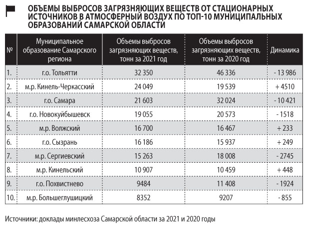 Анализ динамики выбросов за 2021 и 2020 годы показал, что наиболее загрязненным муниципалитетом региона по количеству выбросов считается Тольятти (см. инфографику №1) — 32,35 тыс. тонн выбросов в атмосферу в 2021 году против 46,33 тыс. тонн в 2020-м. За последний год количество выбросов на этой территории снизилось, что говорит об усилиях сосредоточенных здесь промышленных предприятий по снижению воздействия на окружающую среду. В Самаре удалось уменьшить количество выбросов на 10,42 тыс. тонн. Увеличились выбросы за тот же период в Сызрани, а также в Кинель-Черкасском, Волжском, Кинельском районах губернии.