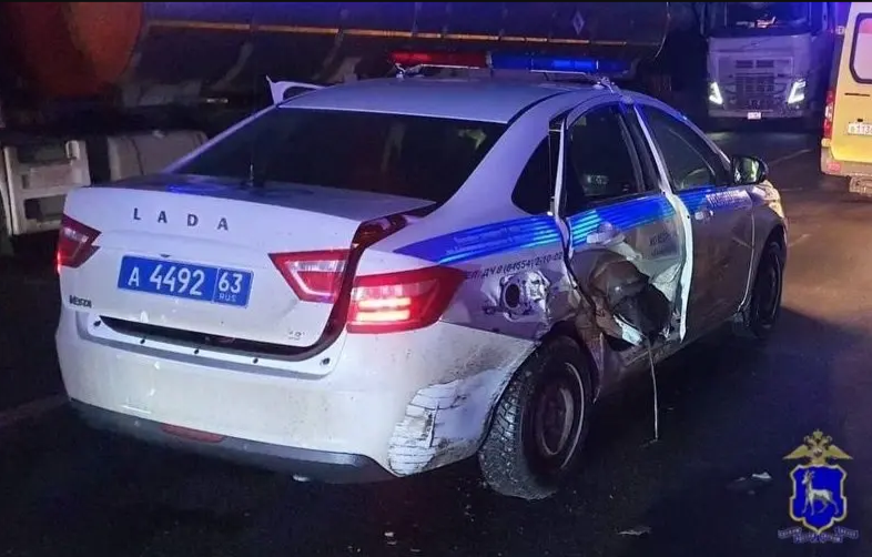 После удара водитель Jetour потерял управление и столкнулся с патрульным автомобилем ДПС — Lada Vesta, который направлялся к месту несения службы в Кинельский район.