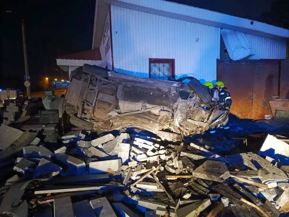 Иномарка не только снесла ограждение, но и пронеслась по территории у магазина, где были выставлены для демонстрации несколько десятков надгробных памятников, превратив их в груду камней. Остановился автомобиль только перевернувшись на бок.