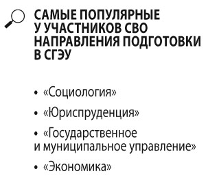 Всего же по итогам приемной кампании 2025 года первокурсниками Самарского экономического университета стали 35 студентов из числа участников СВО. Больше всего их заинтересовали такие направления подготовки, как «Социология», «Юриспруденция», «Государственное и муниципальное управление», «Экономика».