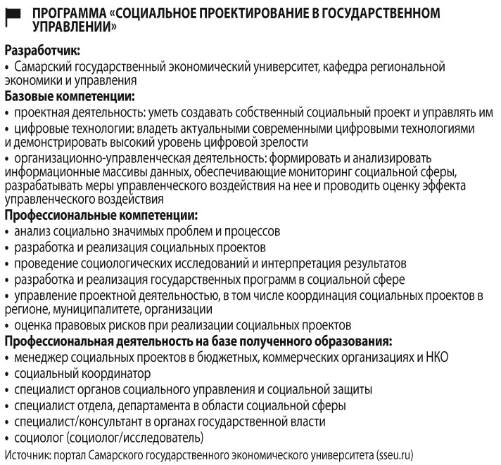 Уникальность новой программы СГЭУ — прежде всего в ее комплексности, говорят в экономическом университете. Выпускник фактически получит одновременно две востребованные специальности и документально подтвержденный уровень своей квалификации в области проектного управления. Программа ориентирована на подготовку высококвалифицированных специалистов со знаниями в области государственного и муниципального управления, социологии и проектного управления. «Эти компетенции сегодня крайне востребованы со стороны органов государственной и муниципальной власти, государственных компаний, сектора НКО», — отмечают в экономическом университете.
