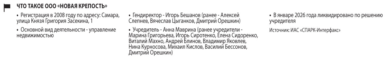 Андрей Блинов руководил фермерским хозяйством «Рассвет» в Богатовском районе и был учредителем ООО «Золотая Волга» (операции с недвижимостью) вместе с дочерью Игоря Сиротенко Анной Бешановой (Мавриной). Еще один бывший учредитель «Новой крепости», Михаил Кислов ранее руководил тольяттинским ООО «Комсомольский рынок» и МП «Парк культуры и отдыха Комсомольского района». Словом, состав собственников фирмы был пестрым. Но вскоре после того как Сиротенко объявили в международный розыск, у «Новой крепости» остался только один учредитель — в мае 2025 года им стала Анна Маврина (Бешанова). В декабре 2025 года общество сменило прописку и прошло перерегистрацию по домашнему адресу в доме №140 на улице Ново-Садовой.