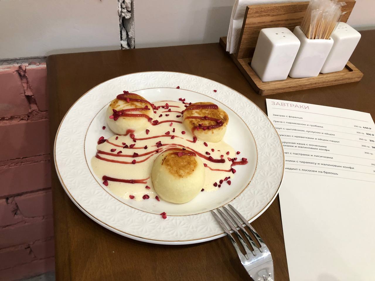 Отдельно раздел с завтраками. Сырники с тирамису и малиновым конфи (380 рублей). Все бы ничего, но ожидаешь как минимум не разогретые, а только что приготовленные. Видимо, не в этот раз. Соус не насыщенный.