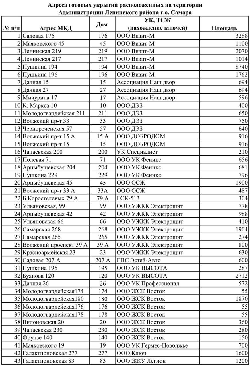 Администрация Ленинского района г.о. Самара опубликовала список мест, где можно спрятаться при ракетной опасности или угрозе атаки беспилотников.