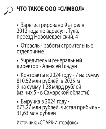 ООО «Символ» зарегистрировано в Туле и специализируется на строительстве и ремонте спортивных объектов. По данным системы «СПАРК-Интерфакс», компания Алексея Гладуна пошла в рост в 2021-2024 годы, что совпадает с периодом, когда тульским спортом руководил нынешний врио вице-губернатора Самарской области Дмитрий Яковлев. В это время «Символ» переключился со скромных контрактов на выполнение строительно-отделочных работ на крупные госзаказы по строительству и ремонту спортобъектов. В 2021 году портфель госконтрактов компании составил 481,9 млн рублей, в 2022-м — уже 558,1 млн, а еще через год — 463,5 млн рублей. 2024 год и вовсе стал рекордным, когда «Символ» положил в свой портфель семь контрактов на общую сумму 810,5 млн рублей, преимущественно с ГУ ТО «Управление спортивными сооружениями», подведомственным минспорту Тульской области.