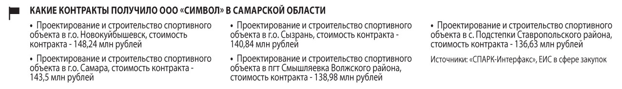 Контракты на проектирование и строительство физкультурно-оздоровительных комплексов в Самарской области тульский «Символ» выиграл в апреле 2025 года. По их условиям компания Алексея Гладуна должна возвести пять модульных ФОКов — по одному в Самаре, Сызрани, Новокуйбышевске, а также в пгт Смышляевка Волжского района и селе Подстепки Ставропольского района. Заказчиком работ выступает подведомственное минспорту ГАУ СО «Самара Арена», которому министерство Лидии Рогожинской перед расторговкой передало соответствующие полномочия. Общая стоимость доставшихся «Символу» подрядов составила 708,19 млн рублей, причем их все компания из Тулы получила на безальтернативной основе — она была единственным претендентом. Самый дорогой ФОК оказался в Новокуйбышевске, его стоимость — 148,24 млн рублей, а самый дешевый — в Подстепках (136,63 млн). Срок выполнения работ по каждому из пяти контрактов — середина декабря 2025 года, тогда как международный форум «Россия — спортивная держава», в ходе подготовки к которому, собственно, и были расторгованы спорткомплексы, прошел в Самаре с 5 по 7 ноября. Как бы то ни было, бенефициар и гендиректор ООО «Символ» Алексей Гладун заверял «СО», что у его компании достаточно «сил и возможностей», чтобы построить в срок все пять самарских ФОКов, тем более что у «Символа», по его словам, уже «есть реализованные проекты подобного типа».