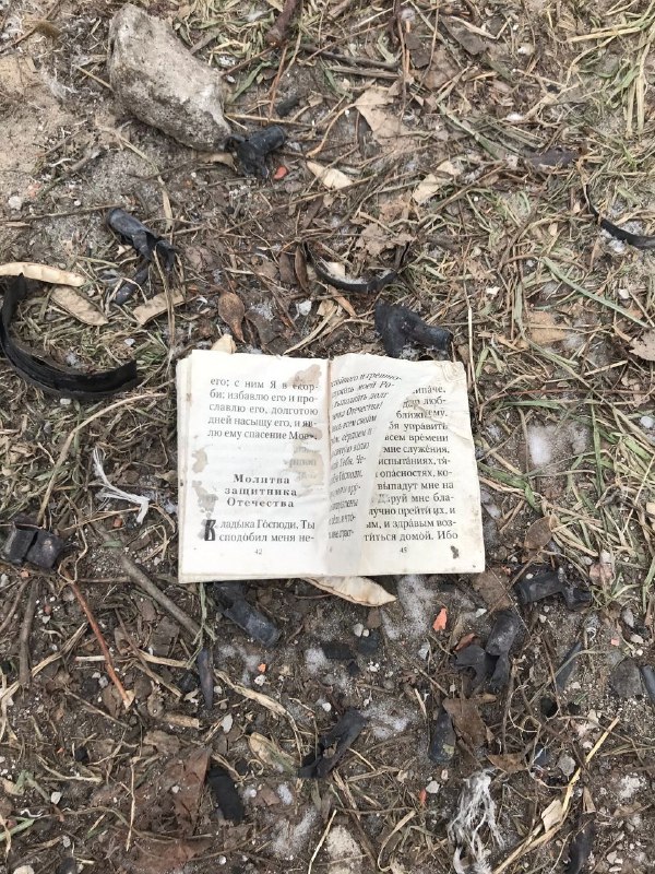 Никишкин опубликовал в группе фото молитвенника, лежавшего среди обгорелых обломков на земле. Книга была раскрыта на странице с Молитвой защитника отечества. История находки впечатляет.