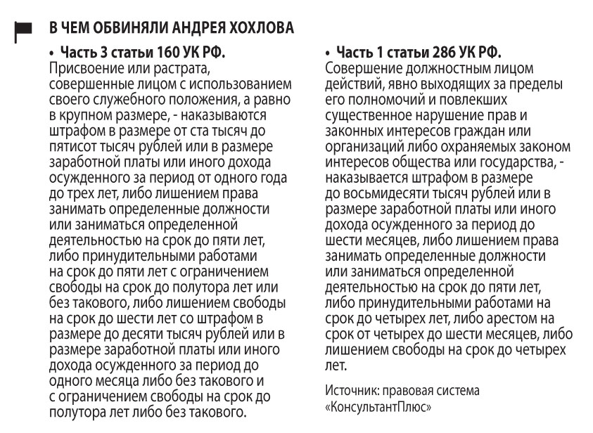 Хохлов на суде виновным себя не признал, заявил, что все свои действия он согласовывал с главбухом предприятия, «обязанной в силу должностной инструкции обеспечить контроль за оформлением первичных документов и принять меры по предупреждению незаконного расходования денежных средств».