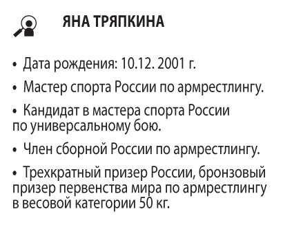 — Мой первый тренер — отец. Как я уже сказала — он у меня универсальный спортсмен-физкультурник. Именно с ним я занималась на турниках, общефизической подготовкой и разными силовыми упражнения, работала с тяжестями и отжималась от пола. Сейчас у нас с ним несколько разные тренировочные планы — он продолжает тренироваться чисто для себя, что называется для поддержания физической формы, а я уже как профессиональный спортсмен. (Улыбается.) Поэтому меня тренирует главный тренер сборной Самарской области по армрестлингу Дмитрий Гребенюк. Под его руководством я стала трехкратным призером первенств России и призером первенства мира.
