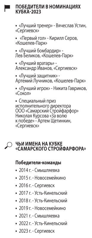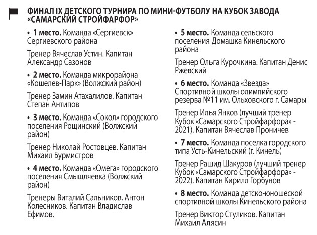 Бронзу увезли мальчишки рощинского «Сокола». «В этом году мы существенно улучшили результат: в прошлом стали восьмыми, а в этом уезжаем с медалями. Все девять лет мы — постоянные участники этого турнира. И как только говорю, что едем на Кубок «Самарского Стройфарфора», кроме «Ура!» от моих ребят ничего не слышно. Это вполне понятно и закономерно, потому что этот турнир всегда отличает высокая организация, и дети это чувствуют», — отметил тренер «Сокола» Николай Ростовцев.