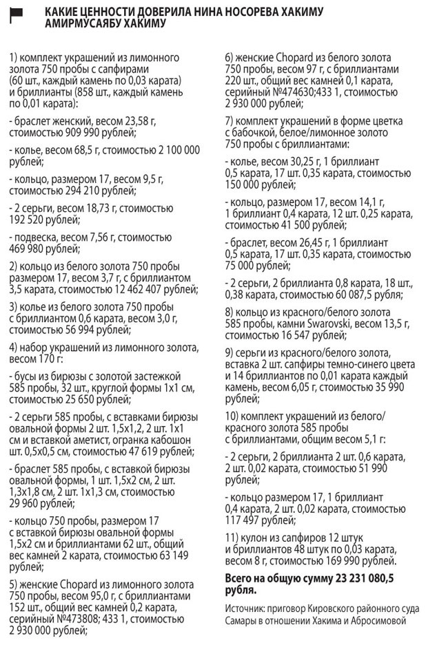 Дальше — больше. Муса убедил Носореву, что спасать необходимо не только наличные деньги, но и многочисленные драгоценности, которые есть у Носоревой, так как злобные кредиторы могут до них добраться. Для реализации задуманного плана Хаким вместе со своей подопечной направились в Тольятти, чтобы забрать ценности. На этот раз они поехали на «Мерседесе» Носоревой. В «Дворянском Доме» его хозяйка забрала из сейфа сундук с драгоценностями на общую сумму более 23 млн рублей и передала на сохранение Хакиму, который пообещал его вернуть после того, как процесс банкротства Носоревой завершится. Позднее Носорева также утверждала, что передала Мусе еще и часы своего мужа стоимостью порядка 3 млн рублей. Всего стоимость своих доверенных Мусе сокровищ она оценивала в 100 млн рублей.