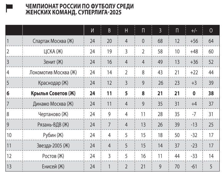 Женская футбольная команда «Крылья Советов» завершила сезон 2025 года на шестом месте в турнирной таблице российской Суперлиги и одержала победу в Маркетинговом чемпионате.